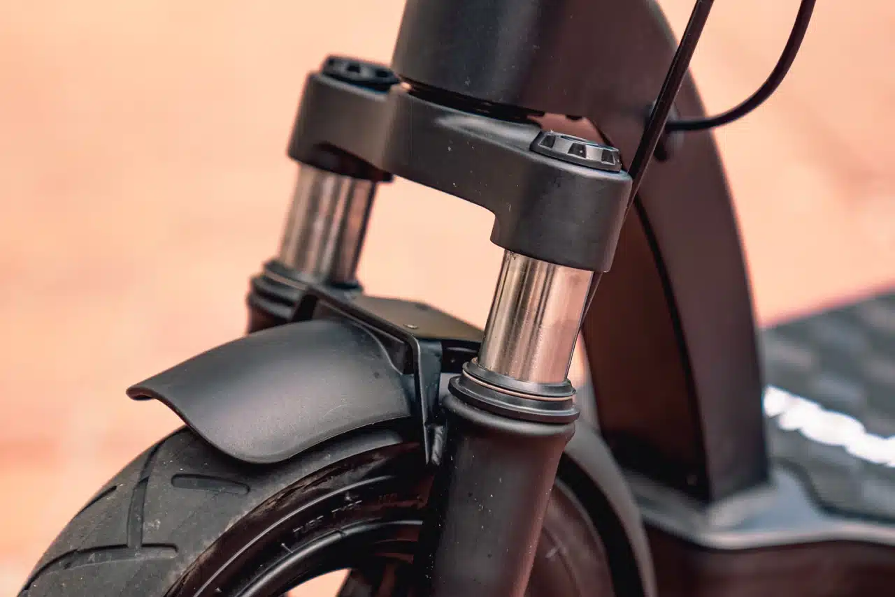 The electric scooter also delivers on exceptional handling, thanks to the front fork spring suspension. The front fork resembles that of a mountain bike, and does a surprisingly good job of keeping the front wheel in firm contact with the road considering it doesn’t have hydraulic damping. The dual spring front suspension works well and is great at this price point, but can clack slightly when topping out.