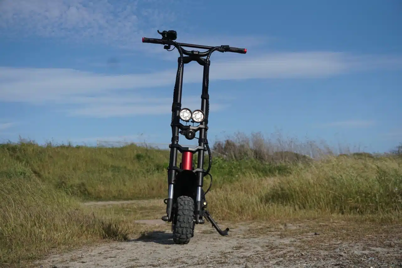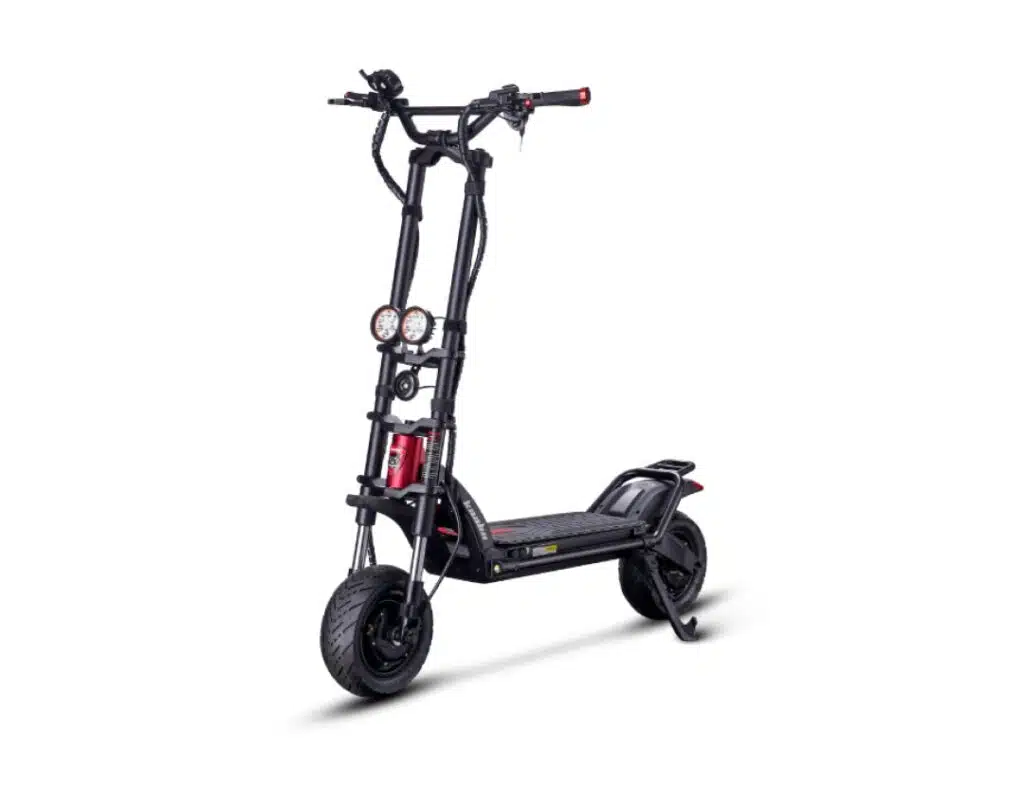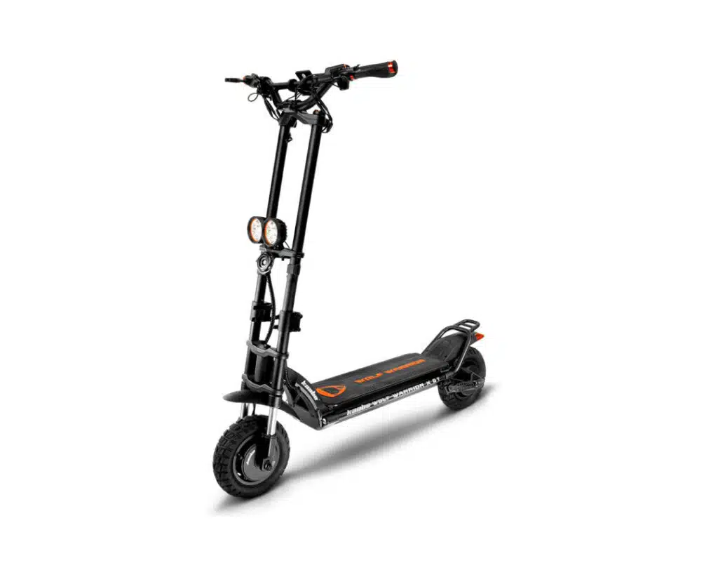 Other than that, the Wolf warrior X dual motor scooter really owns the road. The ride feels like a smaller, more portable version of the offroad beast; the Wolf Warrior 11. You get a top speed of 44.1 mph to facilitate your excursions, riding on one of the best set of 10 inch x 3 inch pneumatics, and the comfort of front hydraulic and rear shock absorbers. Stability can be credited to what has become a Kaabo staple for some of their bigger rides–the oil-damped, dual-stem front end.