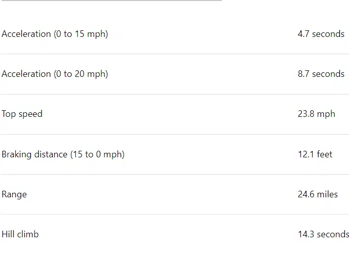 The Quick 4 Super continues to accelerate throughout our entire 10% grade hill climb test, hitting 11 mph at the 200-foot mark and crossing the finish line in 14.3 seconds. While certainly not the fastest up the hill in the single motor category, the fact that it’s still accelerating helps you avoid the dreaded “toy-winding-down” feeling, which is how some scooters respond to the climb.